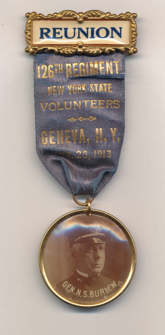 126th New York Infantry reunion badge from the August, 1913 reunion held in Geneva, New York. This example has a celluloid of Noyes S. Burlew who would serve in “C” Company of the 126th. Noyes would be captured at Harper’s Ferry in 1862 when the entire garrison was surrendered. He would later be discharged for a disability in 1863. Post War he would serve of the general for the regiment’s G.A.R. post. This one does have the ribbon detached from the suspension bar.