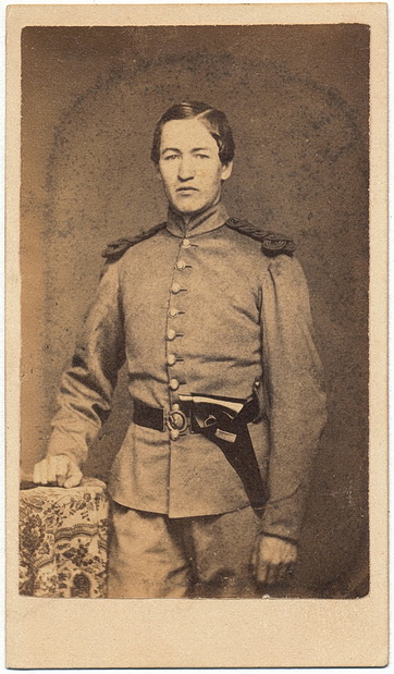 Wonderful carte view of an unidentified member of the 13th Massachusetts Volunteer Infantry. The subject here is posed in the early grey Chasseur uniform with red shoulder knots issued to the regiment. A two-piece eagle militia waist belt is worn along with a holstered revolver which he has folded the flap back to expose the revolver. The elite 13th Massachusetts cost a recruit $12.50 for the privilege of enlisting in the exclusive 4th Battalion of Rifles, but before considering the fee, the applicant needed to be approved by a vote from members of the Boston Militia group. Made up of mostly well educated and out spoken men, Colonel Samuel H. Leonard led the regiment through 3 years of hard campaigns which gained them an enviable service record. They wee generally an insubordinate lot of fellows, but they could fight, and fight they did. They would fight in many of the wars bloodiest battles. Cedar Mountain, Bull Run, Antietam, Fredericksburg, Chancellorsville, Gettysburg and a good many more. They would be mustered out of service in August, 1864 with nearly 20 battles under their belt. Back marked out of Boston, this has a tax stamp on the reverse dated March, 1864.