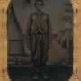 Superb quarter plate tintype of an unidentified member of the 155th Pennsylvania Infantry. The regiment would wear the regulation Federal issue uniform during it’s few couple of years, but in February 1864 they would recieve a uniform inspired by the French Zouave uniform. Brigadier General Kenner Garrard had been working since the fall of 1863 to have the regiments of his brigade learn French Zouave light infantry tactics, and rewarded them with the right to wear the uniform. The 155th Pennsylvania uniform consisted of a French blue pantaloons and a jacket with yellow trim that featured very large yellow “tombeaux”, a stylized false pocket on the front left and right breasts of the jacket. A red Zouave sash with yellow trim, a red fez with yellow trim and a dark blue tassle attached, completed the uniform. The regiment was first tested in battle during the fight at Fredericksburg, where the color guard suffered heavy casualties in an ill-fated assault. At Gettysburg the regiment would suffer 19 men wounded or killed. They would also take part in the Overland Campaign of 1864 and the Appomattox Campaign. They would be discharged in June of 1865. This view shows the infantryman dressed in his newly issued Zouave uniform not long after it was issued in February of 1864. He stands posed in front of this military themed back drop which has been associated with the winter camp located in the vicinity of Alexandria, Virginia. The regiment would wear this uniform until war’s end.