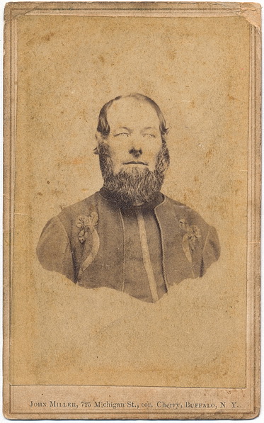 Carte view of an unidentified member of the 164th New York Infantry known as the “Corcoran Guard”. Very nice view of the jacket worn by the regiment with the tombeaux clearly visible. They would see their first action at Deserted House, Virginia in 1863 followed by the Siege of Suffolk and Black Water. In May of 1864, they would take part in the Overland Campaign, fighting at such places as Spotsylvania, North Anna River, Cold Harbor, Petersburg and many others. The following year they would take part in the Appomattox Campaign. The regiment would suffer nearly 250 men killed in battle or due to disease and another 200 men wounded during their enlistment. This example is marked out of Buffalo, New York.