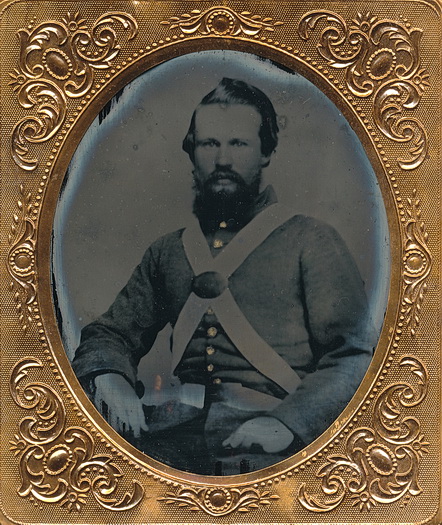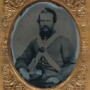 Early war, sixth plate ambrotype of an unidentified member of the 1st Regiment of Virginia Volunteers. Seated pose of this Virginian, he displays the grey frock with buff white cross belts and buff white waist belt associated with the regiment. An unmarked rectangular brass clipped corner belt plate can be seen worn on the belt as well. Attached to the Army of Virginia, they would first see combat during the 1st Battle of Bull Run. They would subsequently see action at such places as The Seven Days, Fredericksburg, Gettysburg, Cold Harbor, Five Forks and a handful of others. Some mat rubs to the emulsion on this one but otherwise a nice image of one of the very first units raised for the Confederacy. Housed in a full leatherette case.