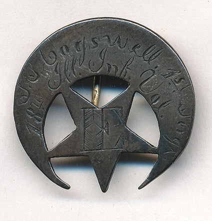 Beautiful and seldom seen, 7th Corps badge identified to Smith L. Cogswell of the 81th Illinois Infantry. Cogswell would muster with “E” Company as a 1st sergeant just a month prior to war’s end. He would serve until the end of the year when he was discharged from the service. This wonderful and rare 7th Corps badge has been cut from a silver quarter, with the front of the quarter sanded smooth and engraved with Cogswell’s information. The face of the badge read, “S. L. Cogswell 1st Sergt. 18th Ill. Inf. Vol.’. The center of the star is engraved with a large letter “E” indicating his company. The reverse of the quarter is still present along with the original pin. Really outstanding badge!