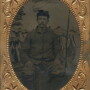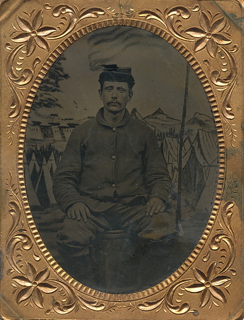 Quarter plate tintype tentatively identified as a member of the 1st Vermont Cavalry. Seated pose resting on a small barrel and dressed in a four button sack coat, heavy trousers and cavalry boots. This fellow has been in the field a while. There are several holes visible in his sack coat, so he has certainly seen some service. He is posed here in front of what is known as the Culpepper back drop which was used during the winter of 1863/64 in the vicinity of Culpepper, Virginia. The attribution to the 1st Vermont Cavalry comes from a second, nearly identical image, which was published in the May-June, 1998 issue of Military Images Magazine on page 39. In that view, the cavalryman sits on the same barrel, dressed in identical attire right down to the flipped up cap on the visor. This one comes housed in a half case which is a little beat up. Seldom seen regiment however.