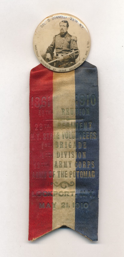 Reunion ribbon for the 28th New York Infantry’s, 49th reunion held in in May of 1910. This example features a red, white and blue ribbon reading “1861 – 1865 49th Reunion 28th Regiment N. Y. State Volunteers 1st Brigade 1st Division 12th Army Corps Army of the Potomac Lockport, N.Y. May 21, 1910″. The ribbon is suspended from a celluloid featuring Colonel Dudley who was mortally wounded at Cedar Mountain on August 9, 1862. Some soiling to the ribbon itself, but otherwise a nice example.
