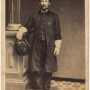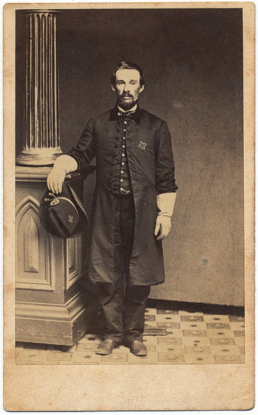 Very nice and seldom seen carte view of a chaplain with the Federal army. Full standing pose, dressed in his very plain frock with cloth covered buttons and dark collar signifying his role as serving as a chaplain. A 6th Corps, 1st Division badge is pinned to the breast of the coat, while another is pinned to the side of his M1851 Hardee hat which he holds while sporting a pair of gauntlets. The reverse of the card has a pencil id which appears to read, “J. H. Beave”. I am not entirely certain the last name. Back marked out of Philadelphia. You don’t see these chaplain views very often.