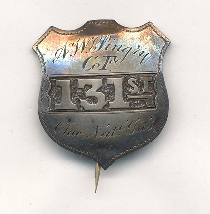 Beautiful silver id shield belonging to Private Andrew Pingry of the 131st Ohio Infantry. Alexander would mustered in on May 2, 1864 at Camp Chase, Ohio and mustered out on Aug. 25, 1864. The regiment served for 100 days and was assigned to garrison duty in Baltimore at Ft. McHenry, Fort Marshall and Federal Hill. It was originally designated the Ohio National Guard, 2nd and 12th regiment, from Montgomery County, Ohio. This custom badge is inscribed across the front, “A. W. Pingry Co. F. Ohio Ntl. Gd’s”. In the center reads, “131st” with a rope border which encircles the entire badge. The one does have the original T-bar pin on the reverse. Measure 1″ in diameter. Beautiful badge!