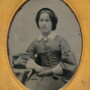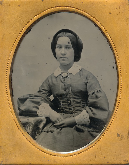 Wonderful ninth plate ambrotype of this beautiful young lady. Sporting the light colored dress with white lace cuffs and collar, she wears a very large brooch at the neck. Very nice focus to this one. Housed in a half leatherette case.