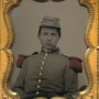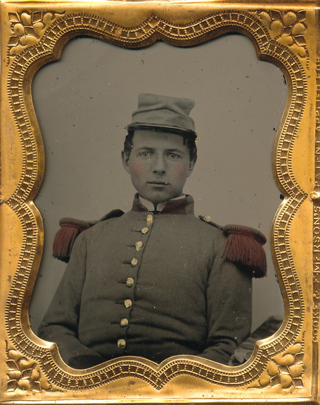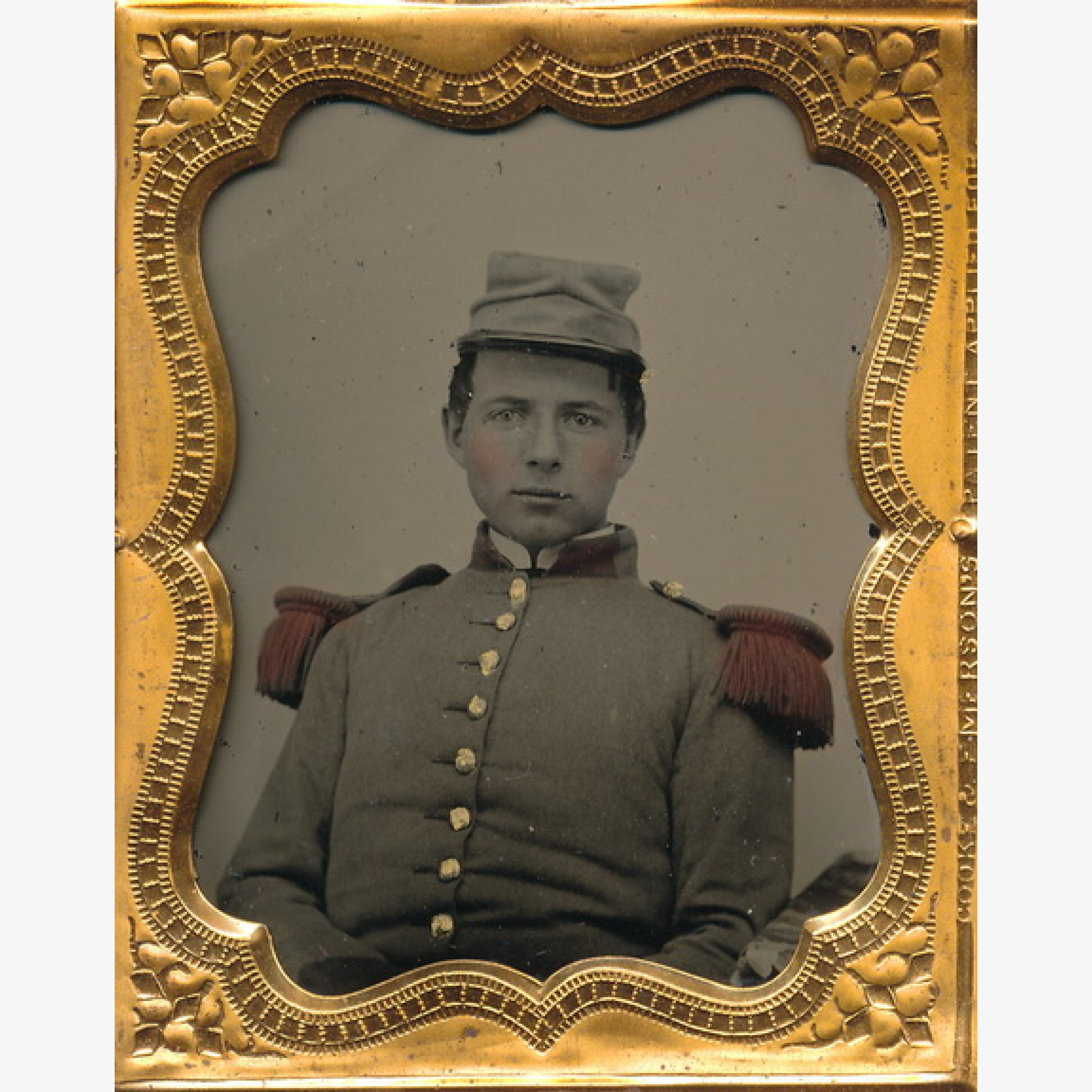 Beautiful ninth plate ruby ambrotype of what is most likely a member of an east coast artillery unit. Massachusetts, New Hampshire or possibly Vermont Dressed in a grey uniform, he sports fringed epaulettes which have been tinted red with unique red trim on the collar as well. The cuffs on the coat are also trimmed. Wonderful clarity to this image. Housed in a full leatherette case.