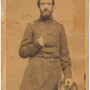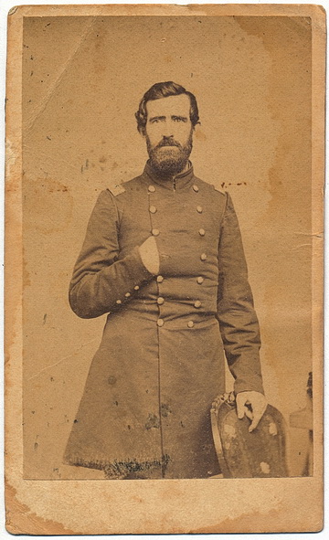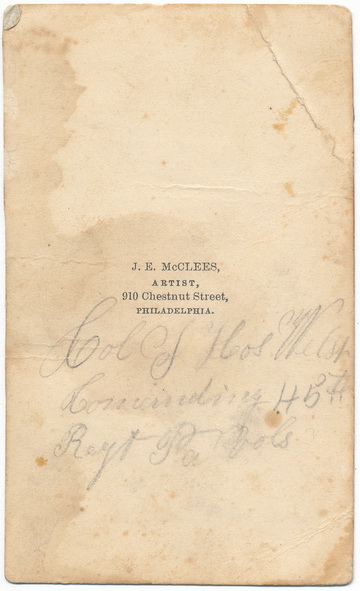 Near full length pose of Brigadier General Thomas Welsh. Thomas previously served during the war with Mexico, and for gallant conduct in the battle of Buena Vista was promoted to a lieutenancy. At the commencement of the Civil War he entered the service as lieutenant-colonel of the 45th Pennsylvania Infantry and was subsequently promoted to the rank of colonel of the regiment. In March of 1863, he was made a brigadier-general of volunteers but later that year on August 14, 1863, he would succumb to congestive fever in acquired during the campaign in Mississippi. This view bears an old pencil inscription on the reverse reading, “Col. Thos. Welsh Commanding 45th Regt Pa. Vols”. There is some wear to this one with soiling and a few small creases. Back marked out of Philadelphia.