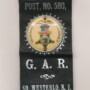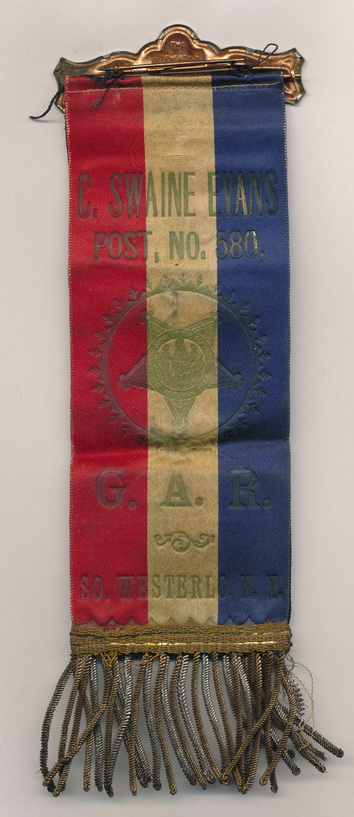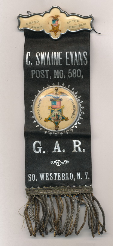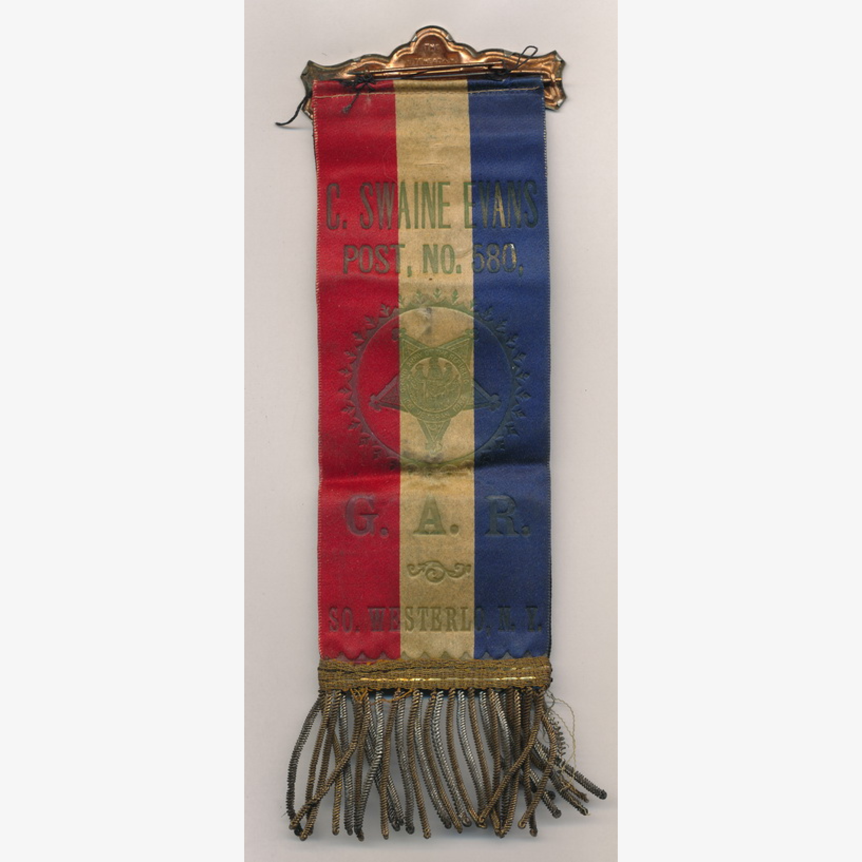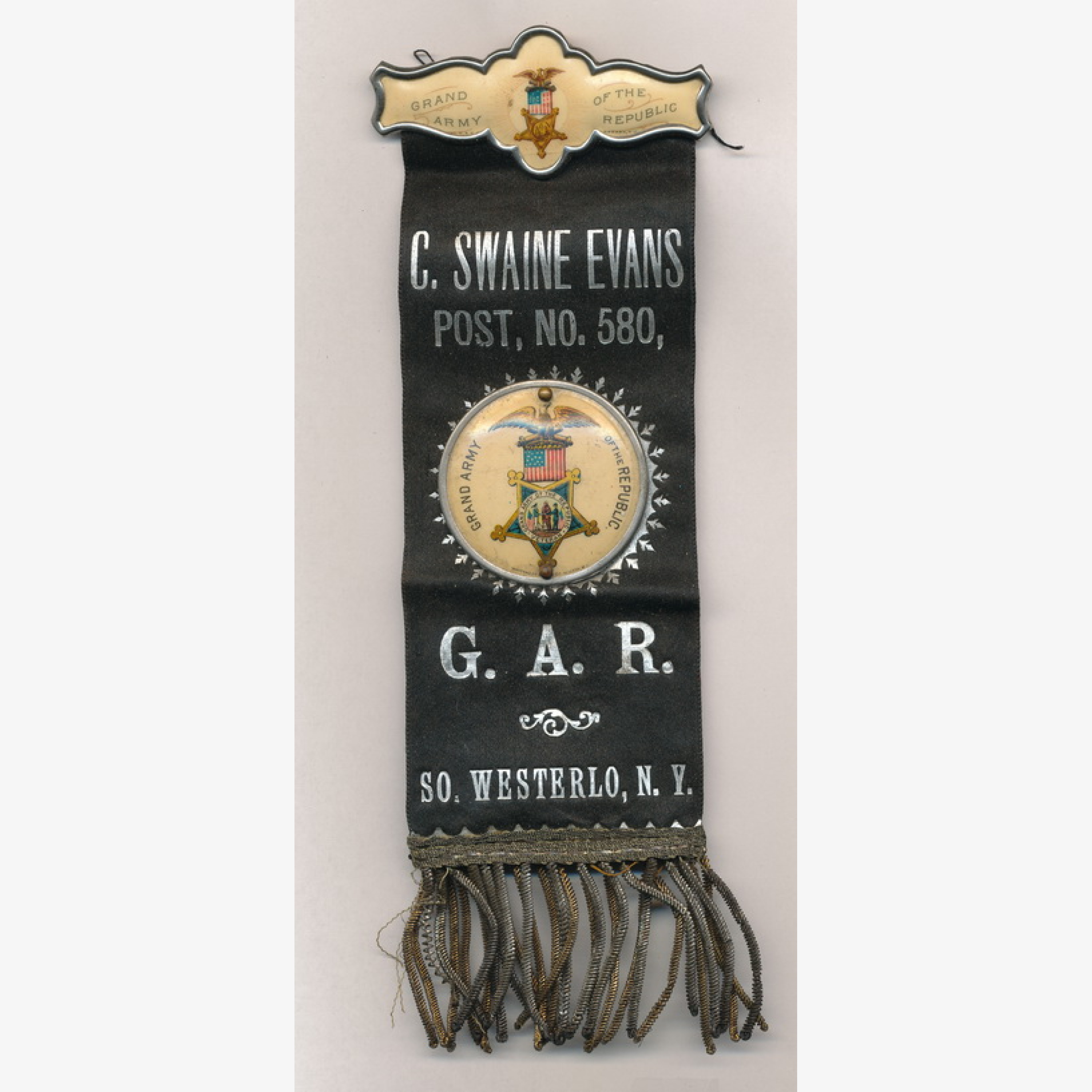 Black silk ribbon for the C. Swaine Evans G.A.R. Post No. 580 located in South Westerlo, New York. This example has the Grand Army of the republic suspension bar from with the ribbon hangs with the G.A.R. celluloid pendant in the center. The opposite side features a red, white and blue ribbon with identical lettering.