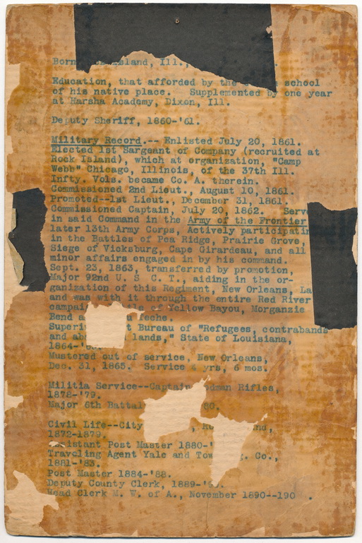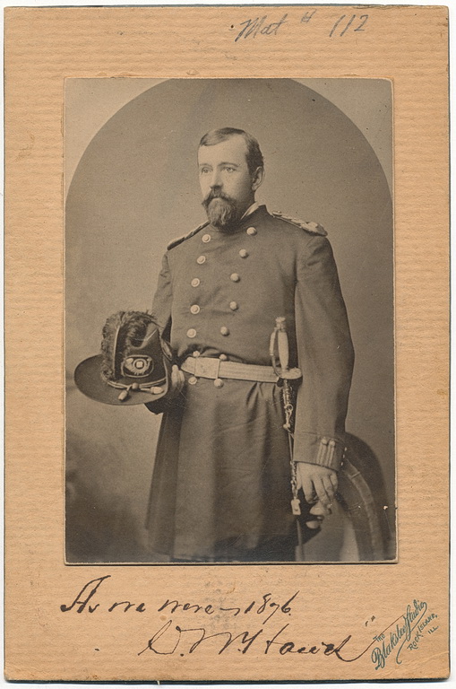 Post war cabinet card identified as Captain Charles W. Hawes of Illinois. At the outbreak of the War in 1861, he was serving as deputy sheriff under his father, who was then Sheriff of Rock Island County. On July 20, 1861, Major Hawes enlisted in Company A, of the Thirty-seventh Illinois Infantry, Volunteers, being made first sergeant of the Company. The Companies of the Regiment assembled at Camp Webb, Chicago, Illinois, and it was there, while the Regiment of raw recruits was being whipped into fighting condition, that Major Hawes received his first promotion. He was commissioned second Lieutenant on August 10, 1861. On December 31, 1861, he was commissioned as first Lieutenant, and on July 20, 1862, one year from the date of his enlistment, he was raised to the rank of Captain. As Captain of his Company, Major Hawes served with credit in the Army of the Frontier, later known as the Thirteenth Army Corps, of which his Regiment was a part. With his Regiment he participated in the Battle of Pea Ridge, the engagements at Prairie Grove and Cape Girardeau and in the memorable siege of Vicksburg.In September, 1863, Major Hawes was again promoted for meritorious service, this time to the rank of Major. He was then transferred to the Ninety-second United States Contraband Troops, then being organized at New Orleans, Louisiana, which Regiment he drilled until orders for active service came. With his Regiment he participated in the Red River campaign, including the battles of Morganzie Bend, Yellow Bayou and Bayou Teche. In 1865 Major Hawes was assigned to duty as superintendent of the bureau of refugees, contrabands and abandoned lands, with headquarters at New Orleans, Louisiana, and was not mustered out of service until December 31, 1865, having rendered a continuous service of four years and six months. In 1878, Charles took the role of the captaincy of the Rodman Rifles of Rock Island, which he made the crack Company of the then strong national guard of Illinois, composed, as it was, largely of veterans of the Civil War. In 1879 Major Hawes was commissioned Major of the Fourteenth Batallion, Illinois National Guard, and this was the last military command held by him. This post war view of Charles is dated 1876 with a period ink inscription reading, “As we were 1876 C. W. Hawes”. Measures 6″ x 9″.