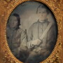 Superb early war sixth plate ambrotype of two Confederate brothers simply identified as Thomas and James Jones. The siblings sit side by side with the older of the two dressed in this very unique uniform. Sporting a grey jacket, a vertical black stripe runs up either side of the breast of the coat with the collar trimmed in black as well. The jacket is accented with a pair of cloth shoulder tabs and matching slash pockets located on either side of the midsection of the jacket. A band of black trim also adorns the cuffs of the jacket as well as each pocket. Armed with a large Bowie knife which is brandished against the breast, he wears a leather waist belt with double roller buckles. The younger of the two is dressed in a much simpler uniform. That jacket appears to be made of some very shoddy material. It lacks any sort of trim but does bear a pair of slash pockets located at the mid section similar to the uniform of the older brother. The younger of the two doesn’t appear to be more than 12 or 13 years of age. He is certainly very young at the very least. A pencil inscription inside the case reads, “Thomas J. Jones & brother James”. The uniform is very similar to those worn by troops from both Mississippi and Tennessee. I did locate a Thomas Jones who mustered at 13 years of age in the 1st Mississippi Cavalry accompanied by a James Jones in the same regiment. Whether or not that is the two men shown here, I could not say. It certainly deserves further research. Regardless a great looking reb image!