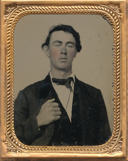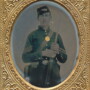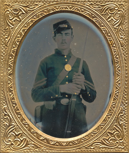 Sixth plate ruby ambrotype identified as John Woolard of the 115th Illinois Volunteer Infantry. John would muster with “F” Company in August, 1862. The regiment would waste no time in heading to the front. They would tale part in the Tullahoma Campaign, Chattanooga Campaign and the Atlanta Campaign. In total, they would fight in over a dozen major engagements and numerous other minor skirmishes. During that time, John would be promoted from a private to corporal. A rank which he held until his discharge in June, 1865. He is shown here dressed in his infantry frock and wearing his corporals rank. A complete set of leather accouterments are worn while gripping his musket. A ninth plate pre-war ambrotype of John also accompanies the image as well as his obituary. The obituary itself contains numerous mistakes. They have incorrectly listed his name as “James Woodlard”, and yet right below his name they list his fathers last name as “Woolard”. This one does come housed in a full patriotic leatherette case with a repaired spine.