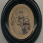 Small albumen mounted in the original black lacquered oval frame. Seated to the right we see an older gentleman with arms folded. In the center, a much younger woman stands holding a bouquet of flowers. Possibly the man’s daughter. The the far left sits an African American woman. Her eyes are averted from the camera as she stares down at the floor. In her lap one can see that she is knitting some small piece of clothing with two knitting needles in her hand. This one is marked on the back by the photographer that operated out of New York. Measures 6.75″ x 5.75″.