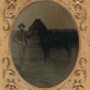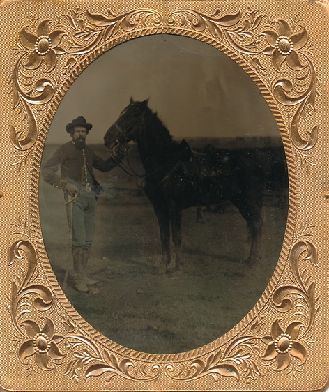 Wonderful sixth plate tintype of this Federal cavalryman posed with his cavalry mount. Standing on an open plain, he stands in front of the horse holding the reins. The bearded soldier stands dressed in his cavalry uniform and leaning on his saber. Very nice tinting to this one with the foreground tinted green and his trousers tinted blue. Really sharp image! This one comes housed in a full leatherette case with a repaired spine.