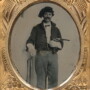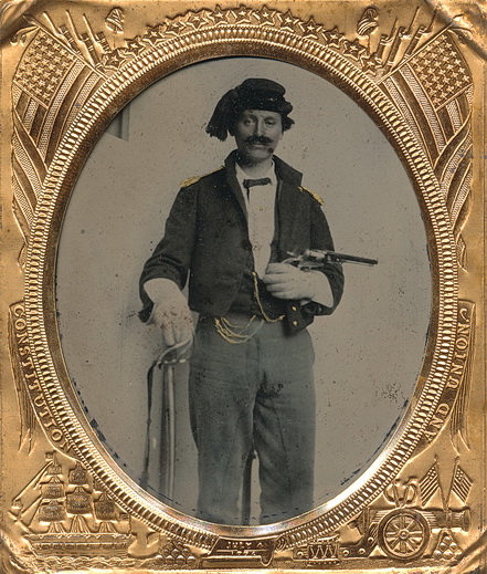 Sixth plate tintype of this Federal cavalryman who seems to be having a good time clowning around for the camera. Sporting a pair of light blue cavalry trousers, he wears his cap with the visor flipped up and a very large tassel hanging off to one side. A fake mustache is worn and held in place by the man pressing his lips upward and pinching it between his nose and upper lip. I’m not sure how many pocket watches he needed, but I count no less than 6 watch chains hanging from the pocket. Wearing a pair of white gauntlets, he grips his sword which is housed in the scabbard and displays this relic of a pistol. Both the barrel and cylinder of the pistol are nicely blued, while the frame is heavily tarnished and even missing the wood grips! There is definitely a story behind this image and I think somebody might have a bit to much “Ole Be Joyful” before stepping into the studio. This one comes with patriotic brass matting and a full leatherette case.