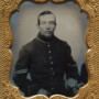 Very nice sixth plate ruby ambrotype of an unidentified infantry corporal. He is shown here dressed in his splendid new infantry frock with the fabric still stiff and unbroken. Corporal’s rank is visible on the sleeve while his M1858 Hardee hat with brass infantry insignia, ostrich plume and hat cord rests on the table at his side. The hat is however mostly obscured once the mat is in place. Very nice clarity to this image. Housed in a patriotic leatherette case with a split spine.