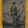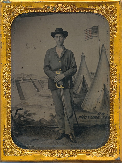 Wonderful quarter plate tintype of this Federal soldier photographed in front of the “US PICTURE TENT” back drop. He appears to be a cavalryman as he sports a pair of re-enforced trousers. However he does appear to be armed with a M1840 saber so artilleryman is also possible. Casually dressed, he is photographed here during the lull of winter camp in 1864. He stands on the bare ground wearing a pair of civilian shoes more accustomed to tooling around winter camp than muddy field operations. This is probably one of my favorite back drops used during the war. There are numerous known photos taken here from all branches of military service including members of the USSS. This image has a great look to it. It does come housed in a full leatherette case with mother-of-pearl inlay.