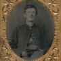 Sixth plate tintype of an unidentified Federal soldier. Seated pose dressed in his military uniform, his forage cap can be seen resting in his lap. At some point, someone took the liberty of adding a small mustache to the portrait. Housed in a half leatherette case.