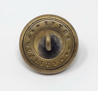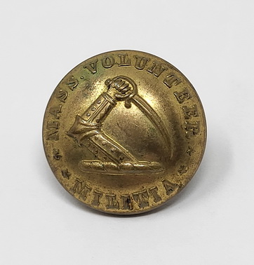 Great looking coat size Civil War uniform button from the state Massachusetts. This is the style listed as MS37 in Albert’s button book and as MS212B2 in Tice’s button book.The face of the button has the famous “Sword in Arm” design that Massachusetts was known for. Around the edge of the button it proudly reads, “MASS VOLUNTEER MILITIA”. The reverse of the button is intact with the original shank still present. This one has the correct Civil War era back mark of “EXTRA QUALITY”. This one still retains about 90% of the original gold gilt to the face of the button. Super nice war date Massachusetts button.