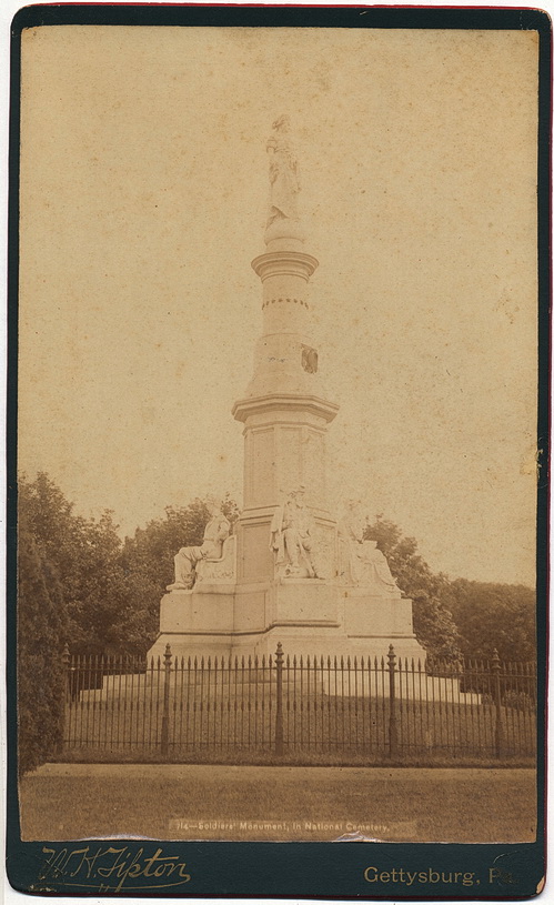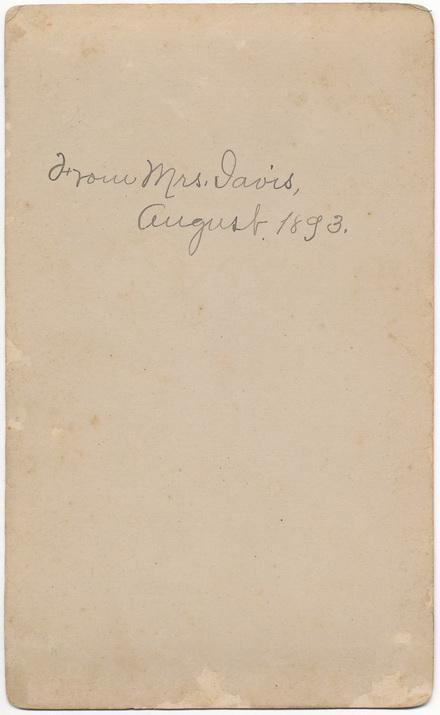 Large cabinet card photo of the Soldier’s National Monument located at Gettysburg. This example is by well known Gettysburg photographer William H. Tipton. The back of the card bears an old ink inscription reading, “From Mrs. Davis August, 1893″. This is unquestionably the hand writing of Varina Davis, wife of the president of the Confederacy, Jefferson Davis! Card measures 8.25″ x 5″. Varina would travel extensively in her later years and attend numerous, both Confederate and Union veteran’s reunions during that time period. In 1893, Varina would be staying at a resort along the Hudson River where she would meet the wife of Ulysses S. Grant. I would assume it was during this stay that she traveled to Gettysburg and acquired this view. Exceptionally rare!