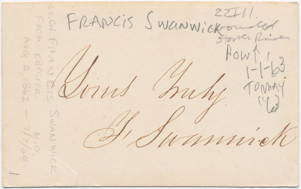 Very nice bust portrait identified as Lieutenant Colonel Francis Swanwick of the 22nd Illinois Infantry. Francis would be commissioned a captain with “H” Company in June of 1861. In February of the following year, he would be promoted to major and before year’s end, to lieutenant colonel. In December of that year, the regiment would be heavily engaged during the Battle of Stones River. The regiment would lose over half of the men who went into the fray, including Swanwick. Wounded in the arm and captured, he would be sent to Atlanta and Richmond until May, 1863. He would return in time for the Battle of Chickamauga which was fought in September. The regiment would remain in the vicinity of east Tennessee until joining Sherman’s Atlanta Campaign in March, 1864. They would fight their way through the summer, 1864 campaign until June of that year when they were ordered back to Springfield to be mustered out of service. Swanwick would leave the service that July. A period ink signature by Francis graces the back of the card reading, “Yours truly F. Swanwick”. No back mark on this one.