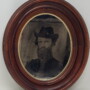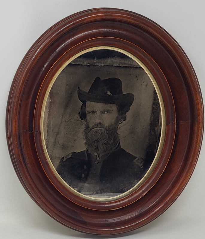 Outstanding mammoth plate tintype of Captain Henry Dobyns of the 6th Kansas Cavalry. Henry would be commissioned a captain with “E” Company in September, 1861. Attached to the Department of Kansas, they would fight on the frontier, mainly in Kansas and Missouri. In total they would fight in 6 major engagements including Prairie Grove, Honey Springs and Massard Prairie. On the 5th of October, 1864, all the men of the regiment whose term of service would expire prior to October 31st, 1864, by order of Brigadier General Thayer, were sent, under command of Lieutenant Campbell, to Fort Leavenworth, Kansas, to be mustered out of service. On 23d of October, while the detachments were en route to Leavenworth, they were attacked at Cow Creek, Missouri, and a skirmish ensued, in which Captain Dobyns, company E, privates Lewis A. McGuire, company A, and Maxwell P. Johnson, company C, were killed, and a number of men were captured. “Captain Dobyns was a brave and good officer, of unexceptionable moral character; kind and generous, loved and respected by all his company, and by all who knew him. He had served his country faithfully for over three years, and was returning to Kansas to be mustered out, and to the enjoyment of the blessings of that Government he had fought so faithfully to transmit to future generations.”. This is incorrectly identified on the reverse in modern ink as Henry’s brother, Joseph. Joseph would enlist on the same day, serving in the same company as Henry, but would reach a rank no higher than corporal. Henry is shown here wearing the rank of captain and wearing this wonderful slouch cap. The tintype itself measures 11″ x 9″. Mounted in the original wood frame, overall it measures nearly 15″ x 12.5″. Exceptional image from a seldom seen state!