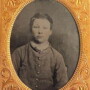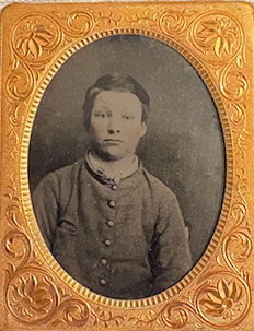 Ninth plate tintype of what appears to be a young Confederate soldier. Dressed in a grey or butternut jacket, a row of small buttons runs down the front with a slash pocket located on the breast of the coat. This kid doesn’t appear to be more than 10 years of age. Housed in a full leatherette case with a separated spine.