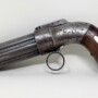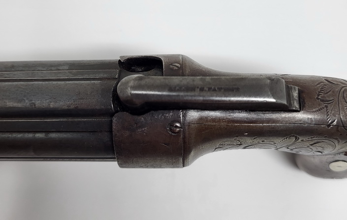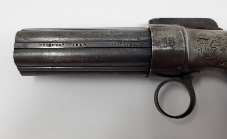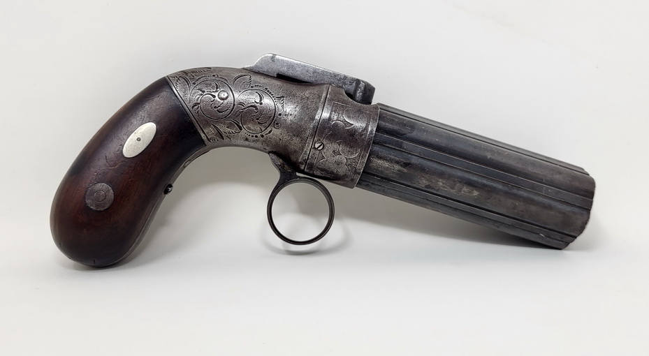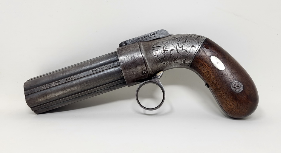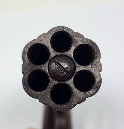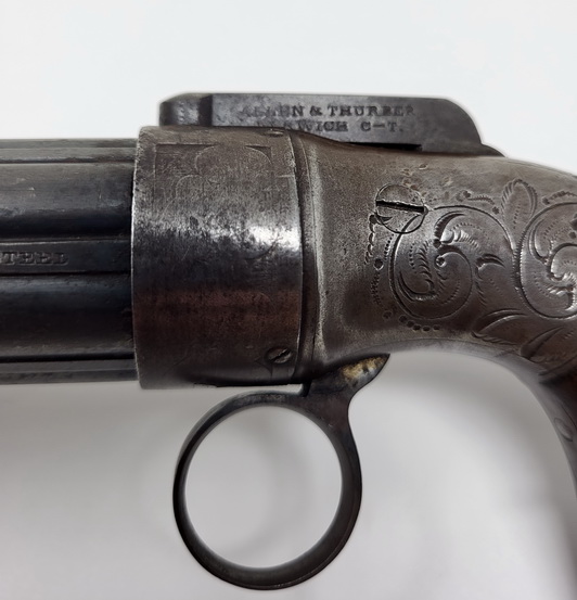Very nice example of the Allen & Thurber Ring Trigger Pepperbox Revolver. Classic Allen’s patent pepperbox, based upon his original 1837 patent mechanism. The right side of the bar hammer is marked in two lines, “ALLEN & THURBER PATENT NORWICH C-T”. The barrel is marked on one of the ribs in a single long line with three separate stamps, “PATENTED 1837 CAST STEEL”. The gun is a 6-barrel pepperbox that is nominally .30 caliber with a 3.5” barrel cluster. The barrels are ribbed, a feature that disappeared with later Allen pepperboxes, as the design eventually evolved to fluted barrels after the firm moved to Worchester. The flash guard is removable and is etched with light foliate motifs. The frame is hand engraved with flowing floral patterns. The backstrap is engraved with light, decorative boarder designs. The pepperbox measures about 6 ¾” in overall length and weighs a little more than a pound unloaded, which is a fairly substantial amount of weight to carry in a pocket. Nice aged patina throughout. The 6 smooth bores of the barrel cluster remain in about good to very condition and show moderately heavy oxidation and some scattered pinpricking and light pitting along their length. The pepperbox remains mechanically fine and functions perfectly. The gun times, indexes and locks up exactly as it should. The two-piece, bag shaped walnut grips are in about very good condition. They remain fairly crisp and sharp and retain some of their original varnished finish, with moderate amounts of edge wear and finish loss. It also has the oval German silver inserts, known as “spangles”, that are associated with the Grafton and Norwich production periods. Overall a very nice piece!