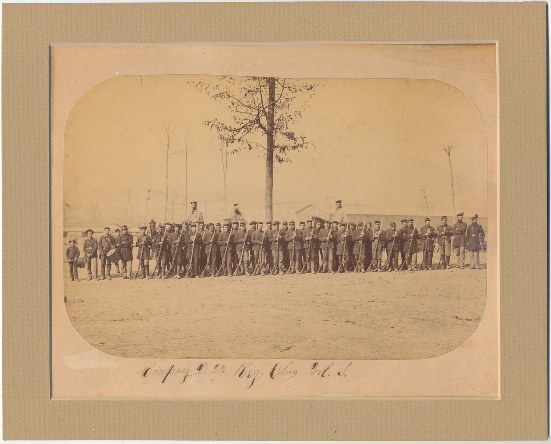 Absolutely outstanding albumen view of members from “D” Company of the 22nd Ohio Infantry. This view includes the entire company including the officers and band members. The men standing shoulder to shoulder armed with their muskets and sporting all manner of dress and head gear. Three officers are seen behind the men mounted on horseback. All of the officers are seen wearing tam o’ shanter’s as are a couple of the enlisted men. Organized at Benton Barrack’s in November of 1861, the regiment was initially designated the 13th Missouri despite the fact that most of the men from the regiment were Ohio natives. The following year they would be re-designated the 22nd Ohio Infantry. The regiment would be active with the Army of the Tennessee fighting at such places as Fort Donelson, Shiloh, Corinth, Iuka, Vicksburg and several others. A period ink id across the front bottom reads, “Company D. 22 reg. Ohio Vol. I.”. This one is matted and ready to be framed. Measures 10″ x 8 1/4″. Super nice albumen view!