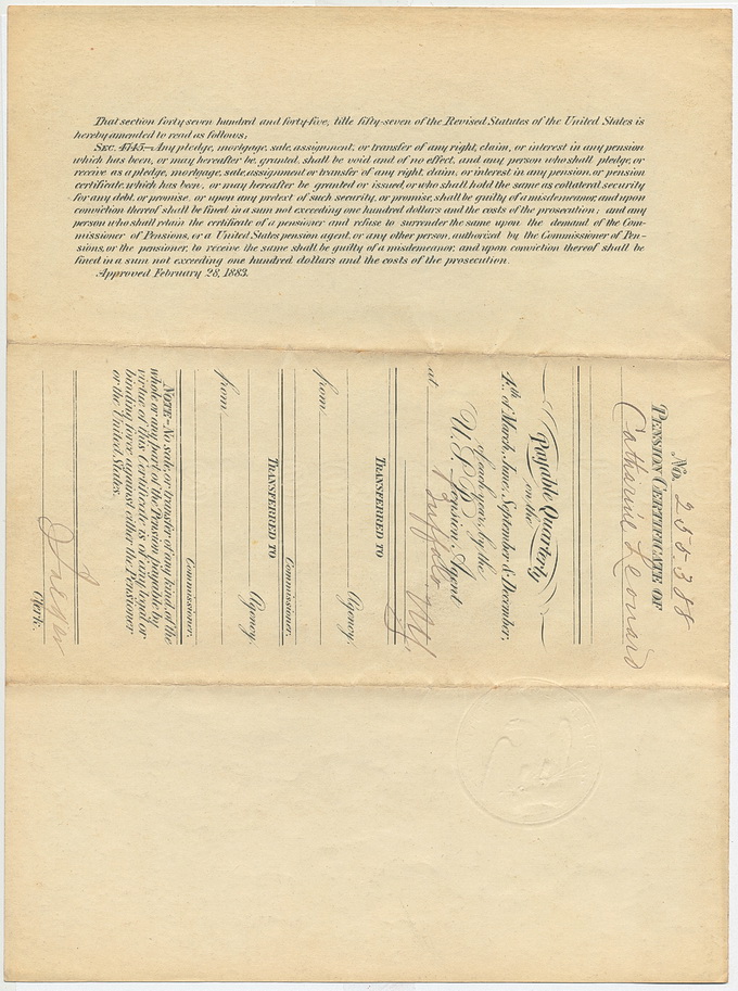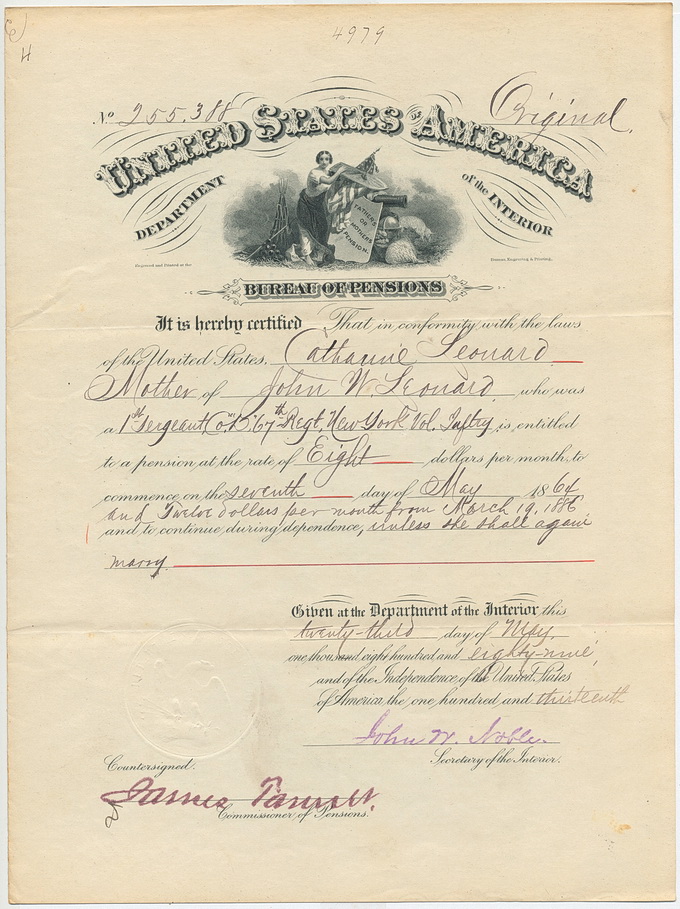 Very nice pension document issued to the mother of 1st sergeant John W. Leonard of the 67th New York Infantry. This example is dated from May of 1889. John would enlisted on May 10th, 1861 at Clyde, New York for a three-year term. He would muster as a private with “D” company with a promotion to corporal and later sergeant that same year and finally to first sergeant the following year. John would re-enlist in December of 1863. In May of 1864, the regiment would take part in the campaign from the Rapidan to the James with the men of the 67th taking in active role in the campaigns first battle, The Wilderness. Initially, John would be reported as captured during the battle but was later determined to have been killed in the fray on May 6th. This pension document which was granted to his mother Catharine, granted her $8 per month beginning in May, 1864. Beginning in March of 1886, the pension was then raised to $12 per month. Overall a very solid document with no rips or tears.