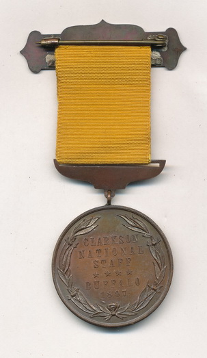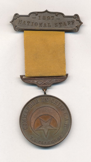Superb personal Commander in Chief badge belonging to Thaddeus Clarkson of Illinois. Born in Gettysburg, Pennsylvania, Thaddeus first mustered as a private in Smith’s Independent Illinois Light Artillery in April, 1861. He received promotions to corporal on May 2, 1861, and to sergeant on July 16, 1861 before mustering out with the battery on the same date. The battery was next reorganized and Thaddeuse re-enlisted the same day as a private in the 1st Illinois Light Artillery and mustered out November 27, 1861. Clarkson subsequently transferred to the 13th Illinois Cavalry in December, 1861, to accept a commission as a first lieutenant, where he was assigned to serve as adjutant for the regiment and was then appointed to the staff of Brigadier General John W. Davidson. Discharged for a promotion to major in December, 1863, he transferred into the 3rd Arkansas Cavalry, a regiment he helped raise and then commanded until the end of the war. He mustered out of the service on September 10, 1864. Thaddeus became active with the G.A.R., serving as Commander of the Department of Nebraska in 1890, Junior Vice Commander-in-Chief of the G.A.R. in 1892, and finally as Commander-in-Chief of the G.A.R. from 1896 to 1897. This badge dates to his final year serving as Commander in Chief and is from the 1897 Buffalo reunion. The front side of the medallion is stamped, “COMMANDER IN CHIEF G.A.R., T. S. CLARKSON”. This one is in wonderful condition as well.