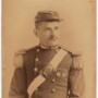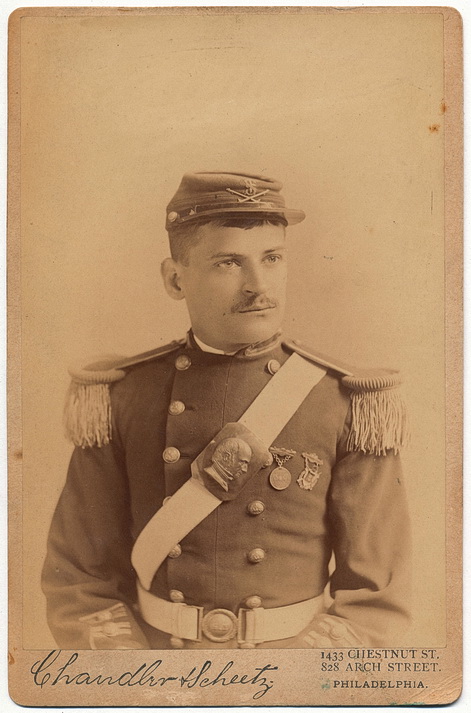 Post Civil War cabinet card of a US cavalryman. Well dressed in his double breasted frock with white buff cross belt and waist belt. His cap is worn with cavalry insignia pinned to the front, fringed epaulettes and two some medals pinned to his breast. This one is by Chandler & Sheetz of Philadelphia.