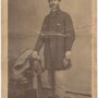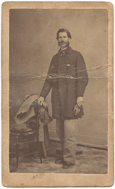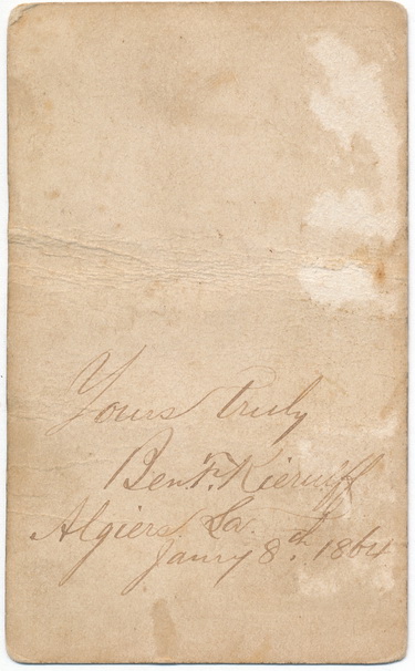 Carte view identified Benjamin F. Kierulff of the 28th Iowa Infantry. Benjamin would muster with “C” Company as a private in September, 1862. For nearly two years, Benjamin would serve among the ranks of the regiment fighting at such places as Port Gibson, Champion’s Hill, the Siege of Vicksburg and the Red River Campaign. In July of 1864, Benjamin would take a promotion to hospital steward where he would serve until wars end. This view shows Benjamin dressed in his winter garb. Sporting a sack coat, he holds a pair of gloves in his hand. Draped over the chair can be seen his greatcoat, scarf and grey slouch cap. A very nice period ink signature on the reverse reads, “Yours Truly, Ben F. Kierulff, Algiers, Ga. Janry 8th, 1864″. This one is effected by a horizontal crease in the middle of the card. No back mark.