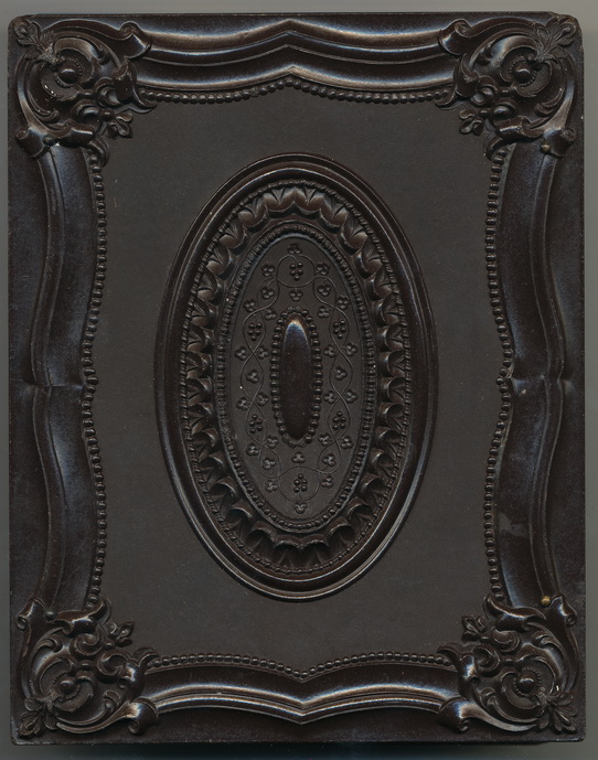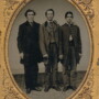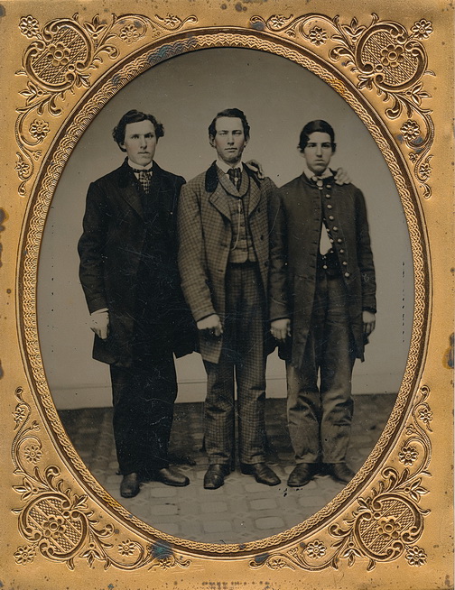Wonderful, half plate ruby ambrotype of a newly recruited Federal infantryman photographed with two fellow men. The infantryman shown here is identified as private George Hinkle of the 49th Pennsylvania Infantry. George would muster with “B” Company in August, 1861. Standing to the far right in this view, he looks less than thrilled at his prospect of serving for the United States military. A second image of George, taken during the same photo session as this example, is shown on his HDS page. George stands dressed in his newly issued infantry frock coat worn over his civilian clothes. The two men shown with George, may have in fact been his older brothers. The 49th joined in the campaign on the Peninsula early in 1862, performing various siege duties at Yorktown, and fighting at Williamsburg, Garnett’s and Golding’s farms, White Oak Swamp and Malvern Hill. On Aug. 16, the regiment was sent to Alexandria, where it was attached to Franklin’s corps, which joined the Army of the Potomac at Centerville and proceeded to Antietam, engaging the enemy on the way at Crampton’s Gap. Winter quarters were established at White Oak Church and on Jan. 9, 1864, the regiment was consolidated into a battalion of four companies, which participated in the “Mud March.” It was active at Salem Church, present at Deep Run, active at Gettysburg, and then joined in the southward movement of the army. It was engaged at Rappahannock Station, and was mentioned in orders for gallantry. It joined in the Mine Run movement, after which it went into winter quarters at Hazel Run. On May 4, 1864, it broke camp and the next day the command was in the heat of the action at the Wilderness. At Laurel Hill the regiment made a most daring assault, but at fearful cost. Colonel Hulings, Lieut.-Colonel Miles 2 other officers and 61 men being killed and 5 officers and 195 men wounded or missing. The next engagement was the assault on the angle at Spotsylvania. The loss up to the 14th of the month when only 130 men were able to report for duty, was 392 killed, wounded or missing. At Cold Harbor the loss was 8 killed and 20 wounded. The regiment proceeded with the army to Petersburg and on July 11, was ordered to Washington, which was threatened by Gen. Early. It followed Early to the Shenandoah river and then returned to Washington, but had scarcely arrived when news of Early’s advance upon Crook caused it to return to Harper’s Ferry. It was active at the battle of Winchester; was posted on guard in the city for a time; then ordered again to Petersburg; shared in the action at Hatcher’s run, and made its winter quarters at Fort Wadsworth. It took part in the final assault on Petersburg; was in the cavalry fight at Sailor’s creek , was then detailed to guard prisoners to Appomattox; next ordered to Danville, where it remained for a month, and then returned to Washington, where it arrived June 2 and remained until mustered out at Hall’s Hill, July 15, 1865. George would manage to survive the carnage and was discharged with the remainder of the regiment. This view comes housed in a very nice full thermoplastic case with typical wear. Very nice view!