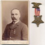 Very nice post war cabinet card identified as Henry H. Sheldon. Henry would muster as a private with “D” company of the 3rd Iowa Infantry in June, 1861. The following April he would be slightly wounded while fighting at Shiloh. Following his re-enlistment in December of 1863, the 3rd Infantry would be consolidated with the 2nd Infantry during the summer of 1864. He would continue to serve until his discharge in July, 1865. Henry would fight at such places as Shiloh, Vicksburg, Sherman’s March to the Sea and others. He is also listed as receiving a second wounding in the left side although the date and location is not noted. This is a beautiful portrait of Henry shown wearing his G.A.R. membership badge. A pencil id across the front bottom reads, “Henry H. Sheldon”. Following the war, Henry would move to Green Bush, Wisconsin and was living there as least as late as 1895. This one is marked out of Plymouth, Wisconsin. Accompanying this view is an original G.A.R. Membership badge identical to the one worn by Henry. Badge consists of a brass spread-winged eagle perched on crossed cannons over a stack of cannonballs. Reverse has the original pin. Suspended from the top bar is a full color US Flag silk ribbon that is in good condition. This is the first time I have encountered one of these with the silk ribbon. The brass star shaped drop has the GAR seal at center with crossed rifles, swords, cannons an anchor and an infantry horn in each of the arms of the star. Reverse has all the Corps badges relating to the entire Union Army. Numbered along the edge “V41286”. Very nice little grouping.