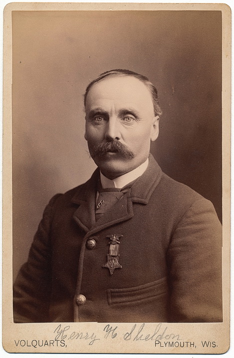 Very nice post war cabinet card identified as Henry H. Sheldon. Henry would muster as a private with “D” company of the 3rd Iowa Infantry in June, 1861. The following April he would be slightly wounded while fighting at Shiloh. Following his re-enlistment in December of 1863, the 3rd Infantry would be consolidated with the 2nd Infantry during the summer of 1864. He would continue to serve until his discharge in July, 1865. Henry would fight at such places as Shiloh, Vicksburg, Sherman’s March to the Sea and others. He is also listed as receiving a second wounding in the left side although the date and location is not noted. This is a beautiful portrait of Henry shown wearing his G.A.R. membership badge. A pencil id across the front bottom reads, “Henry H. Sheldon”. Following the war, Henry would move to Green Bush, Wisconsin and was living there as least as late as 1895. This one is marked out of Plymouth, Wisconsin. Very nice view.