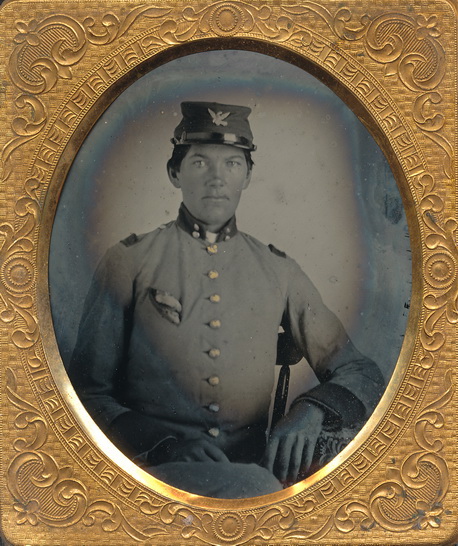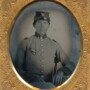 Nice sixth plate ruby ambrotype of a rebel officer from the state of Tennessee. Dressed in a grey frock, the collar and cuffs are trimmed with dark facings which appear to have been red in color. A small slash pocket is located on the breast of the coat while dark shoulder boards are worn. A brass eagle device is pinned to the front of his cap as well. Previously published in the March/April 2009 Edition of Military Images. A copy of that edition is included with the image. Housed in a full thermoplastic case.