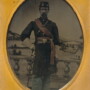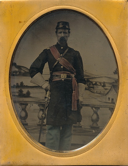 Exquisite quarter plate tintype of this unidentified Federal officer. Full standing pose of this well dressed officer. Dressed in his officer’s frock, a red sash is worn around the waist and over the shoulder. The image is clear enough to view the decorative stitching on the M1851 eagle waist belt he wears around the waist. A rain cover is worn over the cap, while sporting large gauntlets and leaning on his officers sword. Very nice blue tinting to the trousers and a nicely tinted red sash. He stands in front of this rural country themed back drop which is very similar to the back drop used by Gideon Smith of Washington. Although slightly different, it is most likely the same studio used by many members of the Army of the Potomac. Housed in a very nice full thermoplastic case.