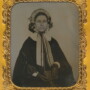 Absolutely gorgeous sixth plate ambrotype of this middle aged woman dressed for winter. She wears this magnificent bonnet from which hang these long, striped ribbons. A scarlet cape is worn over the dress while she holds a bible in here gloved hands. This one comes housed in a very nice thermoplastic case as well. Just an all around beautiful image!