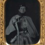 Absolutely stunning pre-war ninth plate ruby ambrotype of this unknown artilleryman. I’m usually not a fan of these portraits with the dark back drop, but this one is the exception. The clarity of this image is magnificent. Dressed in double breasted great coat with a tall collar trimmed in red. The clarity of the buttons is exceptional with the eagle on the face of the buttons visible to the naked eye. A buff white US two-piece militia belt plate is worn while displaying a M1840 saber. The light is just absolutely glistening off the sword and bright brass pommel. A wide red stripe runs down the trouser seam as well. The name of “Chamberlain” is written inside the case along with the numeral “147”. Housed in a full case with a split spine. Just an all around stunning image!