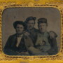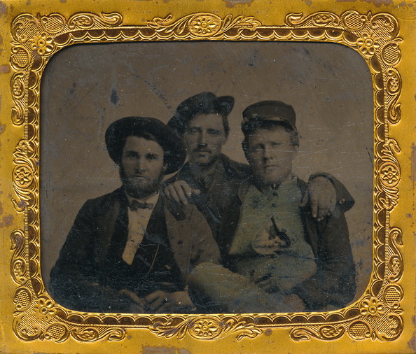 Sixth plate tintype in the horizontal format of a Federal soldier posed with two of his civilian buddies. Nice little portrait of these three showing their comradery for each other. This one does have some wear to the surface of the plate but a nice view with content not often encountered. Housed in a full leatherette case with a split spine.