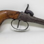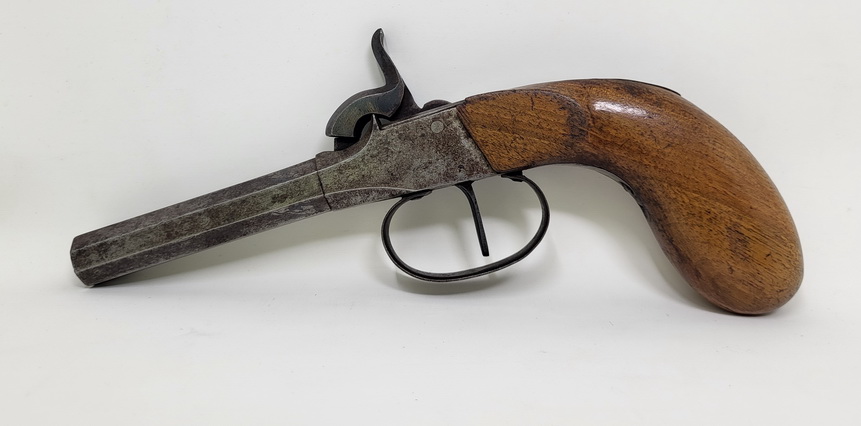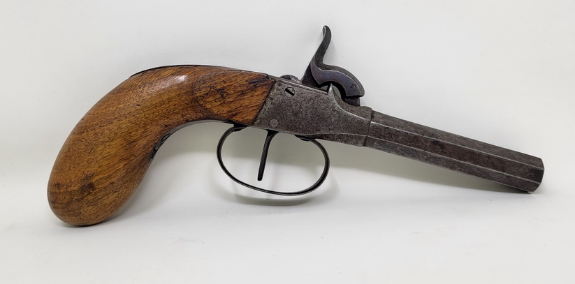 Very nice little boot pistol. This one is in 40 caliber. It is unmarked but is most likely of American production. The hammer still retains most of the original bluing with the remainder of the frame and barrel exhibiting a nice aged patina. No pitting and it is completely functional and very tight. Rifled octagonal barrel and still maintaining the original maple grips. Overall a very solid little pistol