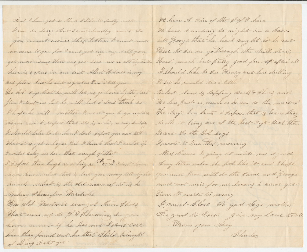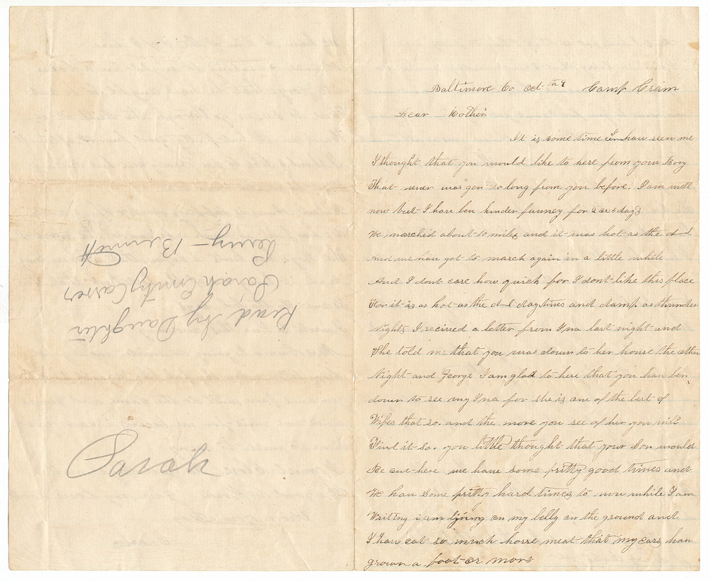 Three page Civil War letter. Dated, “Baltimore Co. Oct. the 9th Camp Gram”. This example is written by a subject only known as “Charles” and is addressed to his mother. The letter mostly discusses family members and matters back home with intermittent details about military life. In one instance, Charles states, “writing I am lying on my belly on the ground and I have eat so much horse meat that my ears have grown a foot or more”. In another instance he is discussing the size of the hogs back home stating, “I bet those hogs are as big as” drew as small picture of an elephant with large tusks! There is an old pencil notation on the last page that reads, “Read by daughter Sarah Emily Carver Perry- Bennett”. While the identity of Charles is not entirely known, he states in the letter that his bed fellow is a man by the name of “Albert Holmes”. That coupled with the name of the daughter may provide the information necessary to identify the soldier. Very nice letter written in ink and very legible.