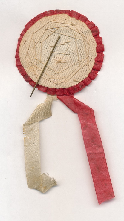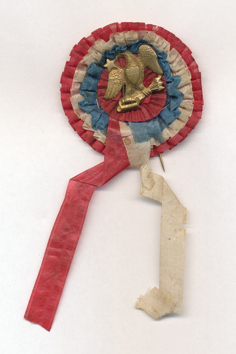 Beautiful, war date patriotic cockade. This example which is produced from silk, features an alternating center ring of red, white and blue with two streaming ribbons of red and white. A stamped brass eagle is placed within the center of the ribbon. Roughly 5″ in length. Some material separation to the white ribbon but it is still attached. It remains in quite good condition given it’s age and delicate nature of silk.